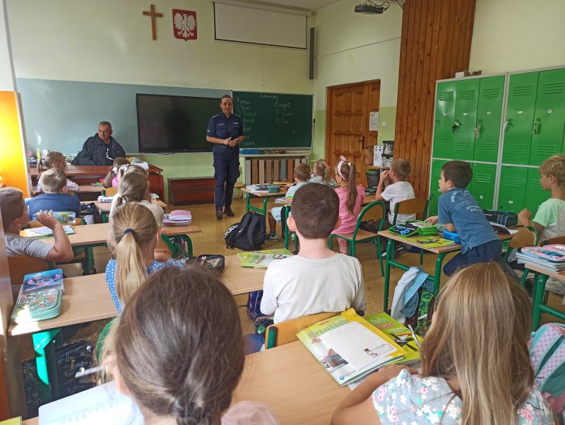 W dniu 9 września 2025 r. uczniowie klas I–III uczestniczyli w spotkaniu z przedstawicielami Powiatowej Komendy Policji w Prudniku, zorganizowanym w ramach ogólnopolskiej akcji „Bezpieczna droga do szkoły”.